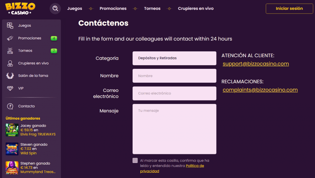Un aspecto fundamental que siempre evalúo en mis reseñas es la calidad del servicio de atención al cliente, ya que un soporte eficaz es esencial para una experiencia de juego satisfactoria. Bizzo ofrece varias opciones de contacto, asegurando que los jugadores reciban la ayuda necesaria de manera oportuna y eficiente.