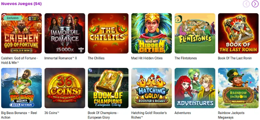 - 🎲 Tragamonedas: Con más de 1500 títulos, las tragamonedas son la columna vertebral de la oferta de juegos. Encontrarás desde las clásicas tragamonedas de frutas hasta las más modernas con gráficos avanzados y características innovadoras.