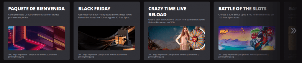 | Bono de Bienvenida | $400 USD + 100 giros gratis | 30x en juegos seleccionados |