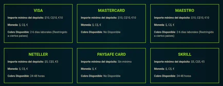 | 💳 Métodos de pago | VISA, Maestro, MasterCard, Neteller, paysafecard. |