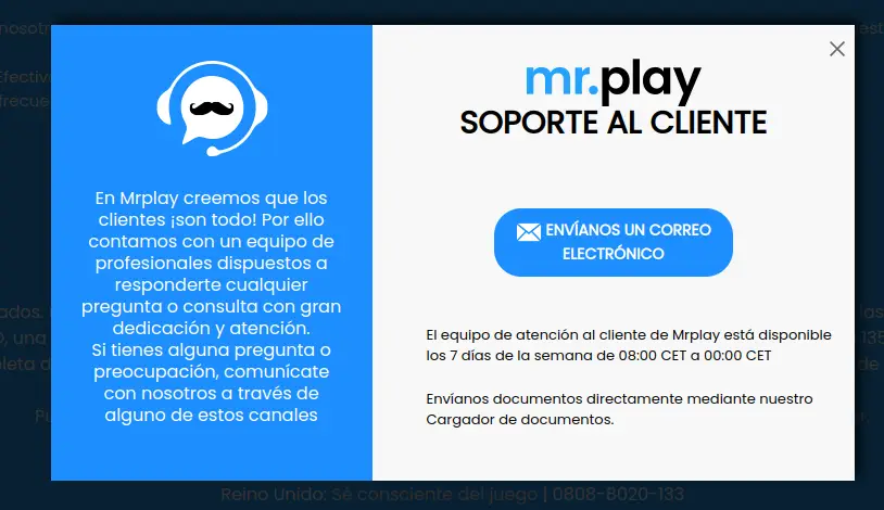 Mr. Play ofrece varias vías de comunicación para asistir a sus usuarios, incluyendo chat en vivo, correo electrónico y un formulario de contacto en su página web. Basado en mi análisis, el chat en vivo parece ser el método más rápido y eficiente de obtener respuestas a consultas generales o técnicas. Este servicio está diseñado para proporcionar asistencia instantánea y es altamente valorado por los jugadores que buscan soluciones rápidas.