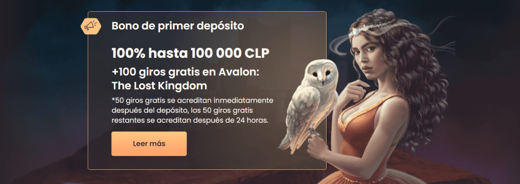 | 🎁 Bono de Bienvenida | 100% hasta 100 000 CLP + 100 giros gratis en Avalon: The Lost Kingdom |