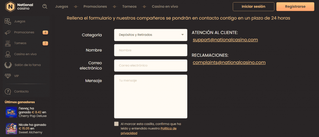 Opciones de contacto del servicio de atención al cliente de National Casino