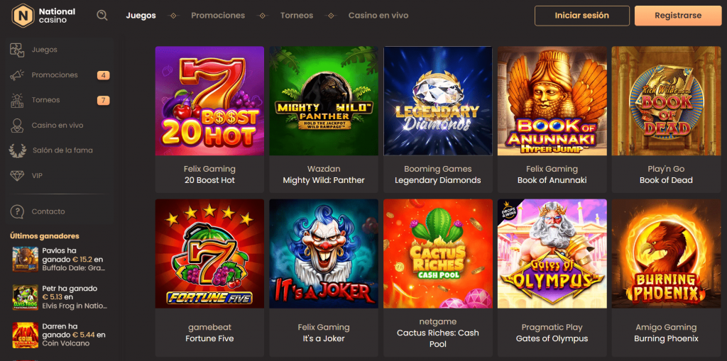 National Casino destaca por su amplio catálogo de juegos, que incluye desde las tragamonedas más populares hasta juegos de mesa clásicos y emocionantes opciones de casino en vivo. En base a mi análisis, la variedad y calidad de los juegos disponibles es excepcional, habiendo colaboración con algunos de los proveedores de software más reconocidos en la industria como NetEnt, Play’n GO, y Pragmatic Play.