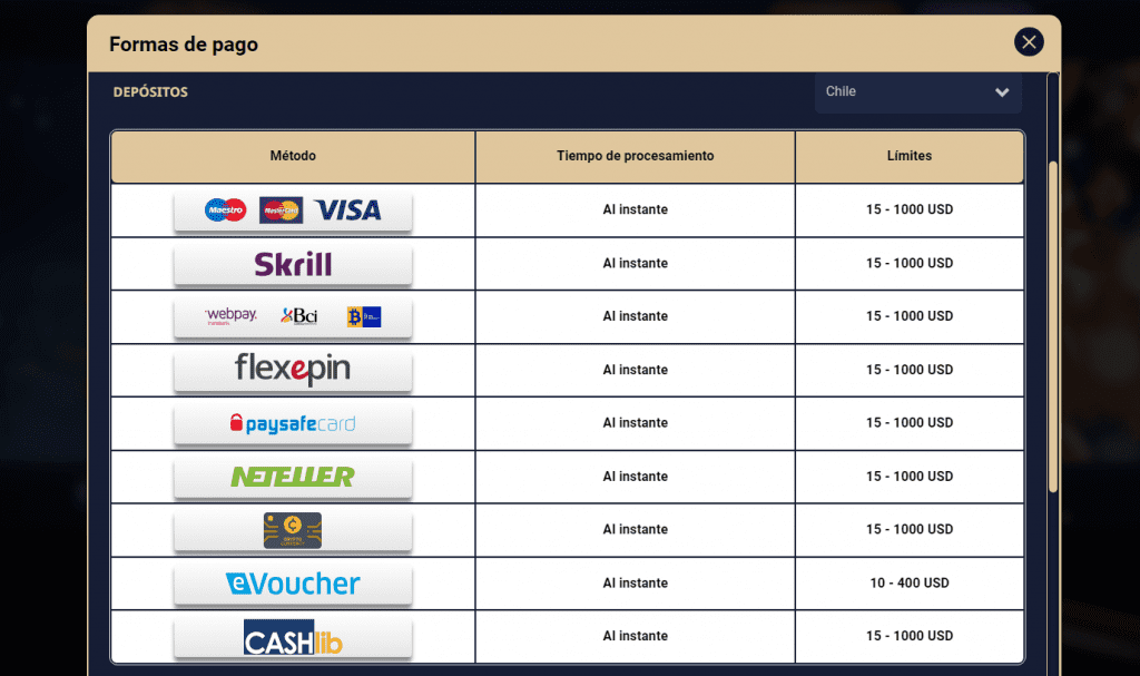 Para los jugadores chilenos, es crucial contar con opciones de pago y retiro confiables y convenientes. En las siguientes secciones, detallaré los métodos disponibles en VegasPlus y proporcionaré información sobre sus respectivas operaciones.