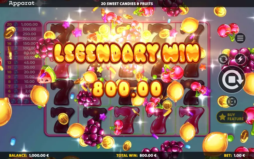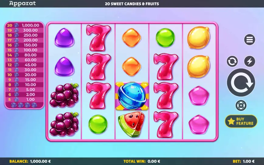 En 20 Sweet Candies & Fruits, Apparat Gaming ha construido un modelo económico equilibrado y accesible, aunque con un matiz: es una slot con potencial explosivo si se entra en la función de bono.