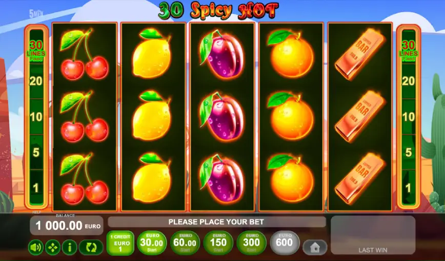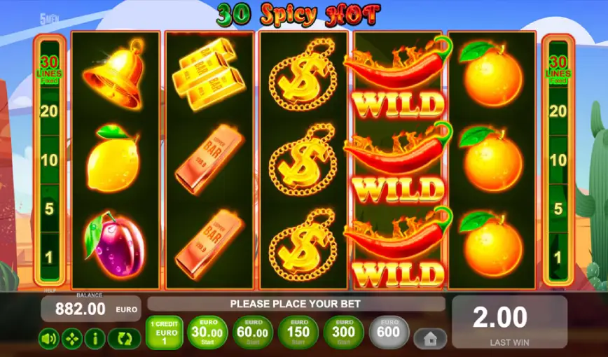 30 Spicy Hot es una tragamonedas de 5 carretes y 3 filas, con 30 líneas de pago fijas. Los jugadores pueden ajustar su nivel de apuesta desde un mínimo de 0.3 hasta un máximo de 300 créditos por giro, lo que hace que el juego sea accesible para diferentes tipos de jugadores, desde aquellos con presupuestos modestos hasta los que disfrutan de apuestas más grandes. La mecánica del juego es rápida y fluida, característica de las tragamonedas de Five Men Games, y ofrece la posibilidad de multiplicar las apuestas hasta 1161 veces.