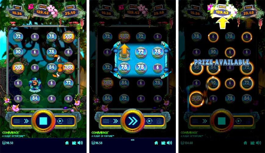 La mecánica CoinVerge™ es el corazón de A Flight of Fortune. Cuando los brackets de tucanes abren y cierran áreas de colección en el tablero, los símbolos dentro de estas áreas se recogen y se suman para crear ganancias. Además, hay varios símbolos especiales que pueden aparecer dentro de estas áreas, tales como monedas multiplicadoras, monedas de actualización y monedas de recolección, cada una ofreciendo bonificaciones únicas que pueden aumentar significativamente las ganancias. Esta mecánica hace que cada giro sea impredecible y emocionante, manteniendo a los jugadores interesados en todo momento.