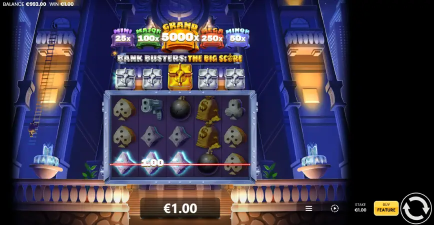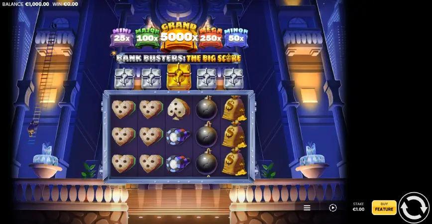 La mecánica de juego de Bank Busters: The Big Score está diseñada para ofrecer una experiencia única y emocionante. Algunas de las características clave son el símbolo Wild, la recogida de efectivo, las cajas fuertes, las tiradas gratis, el doble azar y la opción Buy Feature. Cada una de estas mecánicas trabaja conjuntamente para crear una experiencia de juego dinámica. Por ejemplo, los símbolos Wild no sólo sustituyen a otros símbolos, sino que también interactúan con los símbolos de moneda para acumular recompensas. Las cajas fuertes de los rodillos pueden desbloquearse con una tirada de comodines, lo que proporciona bonificaciones como tiradas gratis y multiplicadores. La opción Double Chance te permite aumentar tus posibilidades de activar el juego de bonificación, mientras que la función Feature Buy desbloquea el acceso instantáneo a las tiradas gratuitas por un coste adicional. Estas mecánicas no sólo dan profundidad a Bank Busters: The Big Score, sino que también mantienen a los jugadores en vilo mientras aspiran a conseguir un premio máximo de 5.450 veces su apuesta.