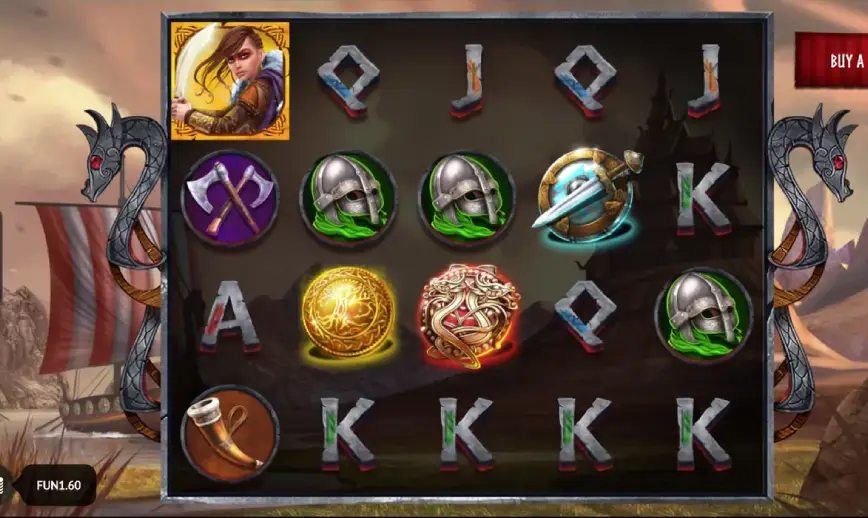 El aspecto visual de Battle Maidens es impresionante, con gráficos de alta calidad que realmente dan vida a la temática vikinga. Los símbolos del juego, que incluyen espadas, dragones y cascos vikingos, son vívidos y detallados, destacando en cada giro. Aunque el fondo del juego puede parecer un poco más sencillo en comparación, presenta un sereno lago, un barco vikingo y una costa rocosa que complementan perfectamente los elementos más dinámicos de la pantalla.