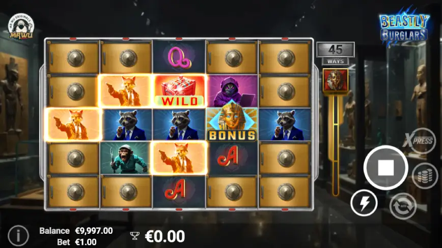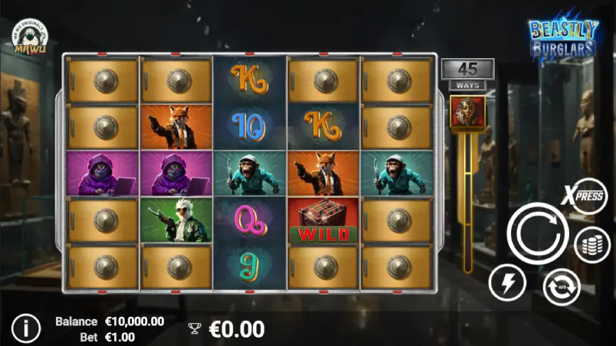 La tragamonedas se inspira en una historia clásica de atracos, pero con un giro innovador: los criminales son animales, no humanos. Este enfoque no solo añade un toque de humor, sino que también permite a los jugadores disfrutar de una historia más desenfadada mientras intentan desbloquear posiciones en la cuadrícula del juego y activar multiplicadores en los carretes, todo en un entorno que evoca a un museo de artefactos antiguos.