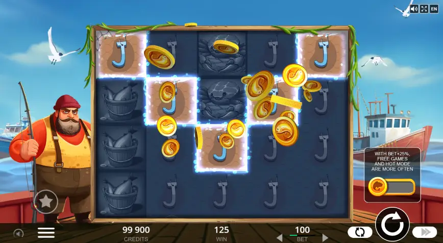 - 💯 Aprovecha el Símbolo Wild: El capitán, que actúa como símbolo Wild, es crucial para formar combinaciones ganadoras. Este símbolo no solo sustituye a otros símbolos, sino que también recoge los valores de los símbolos de Crédito y de las monedas de Pez cuando aparecen juntos. Asegúrate de estar atento a estas combinaciones para maximizar tus ganancias.