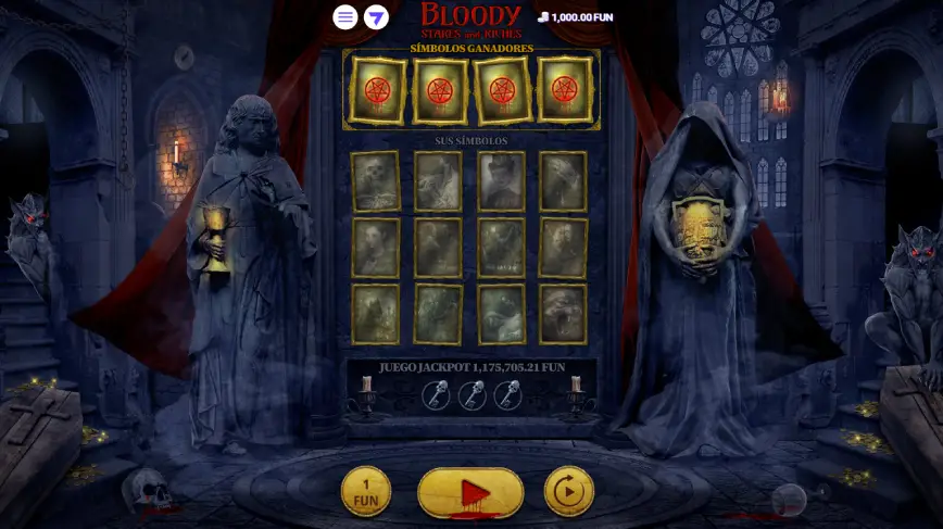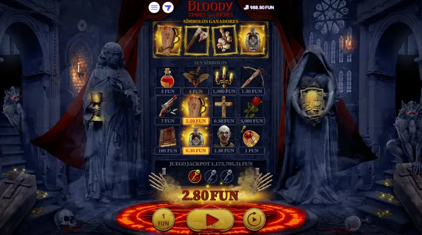 Bloody Stakes and Riches es una tragamonedas que sumerge a los jugadores en un mundo vampírico y lleno de misterio. La fascinante atmósfera oscura y gótica del juego está diseñada para capturar la atención de aquellos que buscan una experiencia de juego única y emocionante. Este tema no sólo atrae a los aficionados a lo sobrenatural, sino que también ofrece una atmósfera intrigante que puede cautivar a un amplio abanico de jugadores.