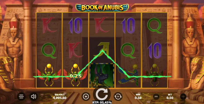 Las opciones de apuesta van desde tan solo 0.10 hasta 50 monedas por giro. Esta amplia gama permite que tanto los jugadores que prefieren apuestas más bajas como aquellos que se inclinan por apuestas más altas puedan disfrutar del juego a su propio ritmo. La diversidad en las opciones de apuesta asegura que el Book of Anubis sea accesible y atractivo para un público amplio, permitiendo a cada jugador ajustar su experiencia de juego según sus preferencias personales y su presupuesto.