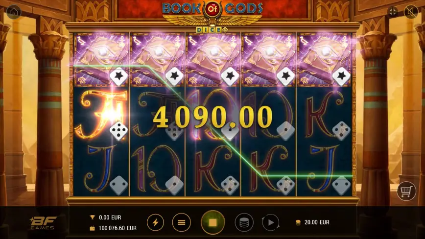 La ambientación sonora utiliza instrumentos de inspiración egipcia, fusionados con efectos clásicos de tragamonedas. Los visuales, por otro lado, optan por un enfoque estilizado, evitando tanto lo caricaturesco como lo hiperrealista. El resultado es elegante, nítido y llamativo, especialmente durante la animación de bonificación del Book of Gods Dice, cuando el Libro se revela emitiendo una luz dorada y los símbolos especiales proliferan con una especie de resplandor divino.