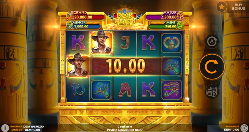 - 🎰 Juego de Bonificación del Jackpot: Se activa al obtener 3 o más símbolos de Libro. Los jugadores comienzan con 3 respins, y cada nuevo Scatter resetea el contador de respins a tres, aumentando las posibilidades de obtener jackpots.