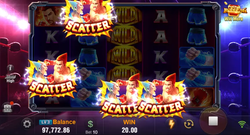 Una de las características más notables de Boxing King es la “Función de Cascada”. Con esta mecánica, cuando logras una combinación ganadora, los símbolos involucrados desaparecen y nuevos símbolos caen en su lugar, ofreciendo la posibilidad de ganar consecutivamente. Esta función no solo aumenta las oportunidades de ganar, sino que también incrementa la intensidad y el dinamismo del juego.