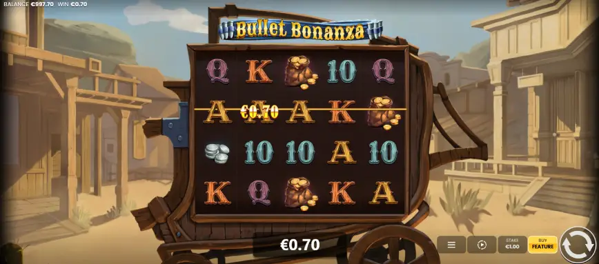 El Bullet Bonanza cuenta con un formato clásico de 5 carretes y 20 líneas de pago, una configuración familiar que es ideal para jugadores de todos los niveles de experiencia. Este diseño equilibra bien la simplicidad con la oportunidad de obtener frecuentemente combinaciones ganadoras. Las líneas de pago están claramente definidas, y los jugadores pueden seguir fácilmente el progreso de sus ganancias a medida que los símbolos se alinean de izquierda a derecha.