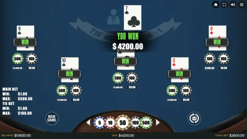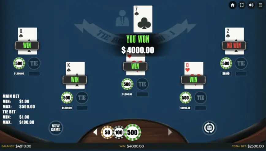 El juego se desarrolla con un mazo estándar de 52 cartas. El objetivo es claro: obtener una carta de mayor valor que la del dealer. Si logras esto, ganas una apuesta igual al monto original. La simplicidad de esta mecánica hace de tragamonedas una opción ideal para aquellos que buscan un juego fácil de comprender y de acción rápida.