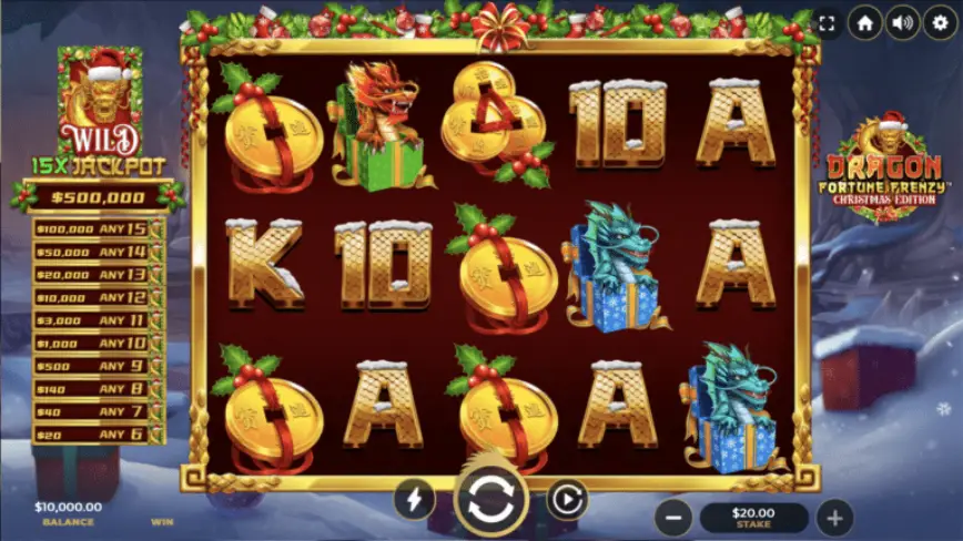 La Dragon Fortune Frenzy Christmas Edition presenta una disposición clásica de 5 carretes y 3 filas, junto con 10 líneas de apuesta. Esta configuración es ideal para quienes prefieren una estructura más sencilla y fácil de seguir, especialmente para los nuevos jugadores. A pesar de su simplicidad, este formato ofrece suficientes oportunidades para crear combinaciones ganadoras, manteniendo a los jugadores comprometidos y emocionados a cada giro. Además, el rango de apuestas (desde 0.1 hasta 20) permite que tanto jugadores con presupuestos limitados como aquellos que disfrutan de apuestas más grandes encuentren su zona de confort.