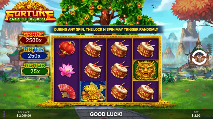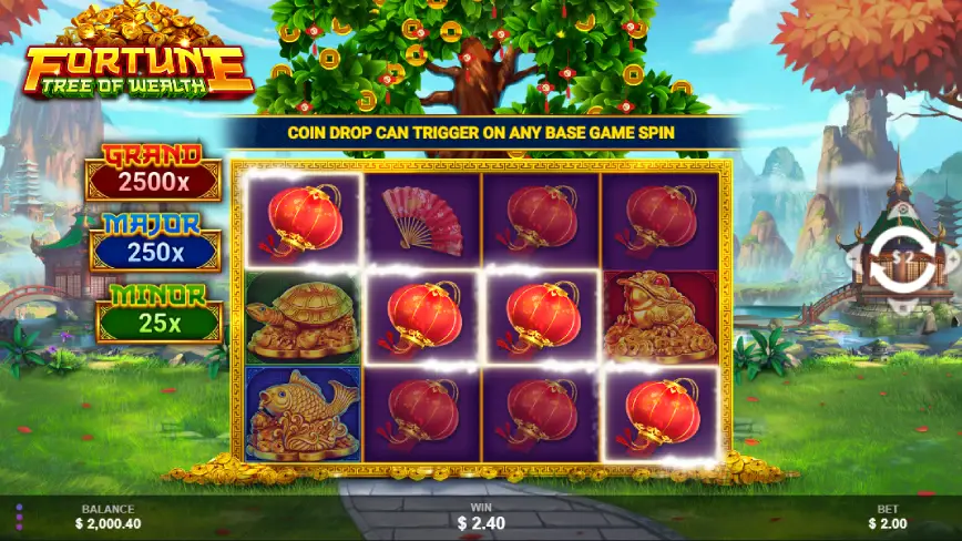 Fortune Tree of Wealth tiene una estructura 4×3, con 4 rodillos y 3 filas. Esta configuración proporciona una jugabilidad dinámica y emocionante al alcance de todos los jugadores. Una de las características más interesantes es el “Coin Drop”, que se activa aleatoriamente tras una victoria, ofreciendo la posibilidad de obtener un multiplicador de hasta 50x. Además, la función “Lock N Spin” puede desencadenar Respins con la posibilidad de ganar el gran premio de 2,500x. Tras los Respins, comienza el Coin Drop, con hasta 8 monedas cayendo sobre los carretes, lo que incrementa la emoción y las oportunidades de ganar. Esto convierte a Fortune Tree of Wealth en una opción muy atractiva para aquellos que buscan una experiencia de juego rica en características y potencial de ganancias.