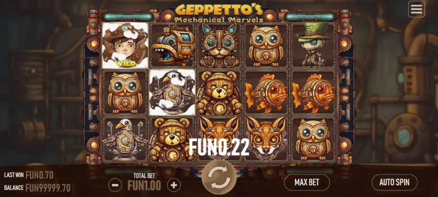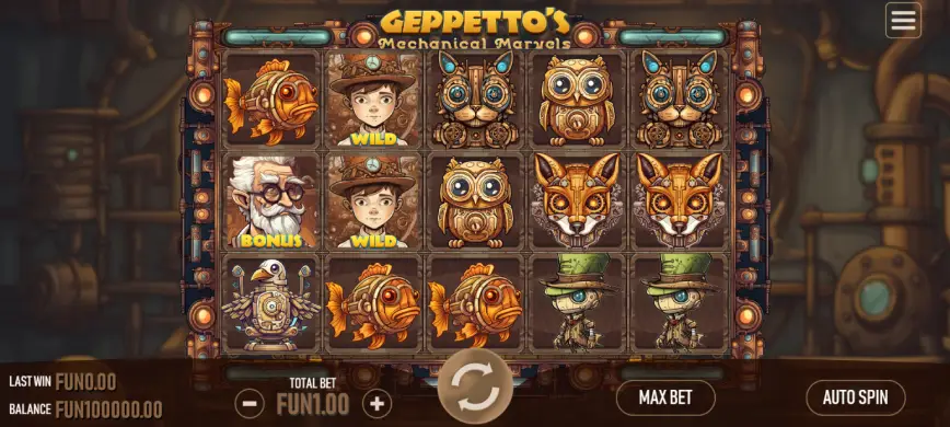 Geppetto’s Mechanical Marvels utiliza una paleta de colores vibrantes y animaciones suaves para enriquecer la experiencia visual. Cada símbolo en los carretes está meticulosamente diseñado, desde los engranajes y ruedas dentadas hasta los propios animales mecánicos, lo que permite una inmersión completa en este mundo fantástico. Esta atención al detalle en el diseño gráfico no solo mejora la estética del juego, sino que también mejora la experiencia general del jugador, haciendo de cada partida una experiencia visualmente atractiva.