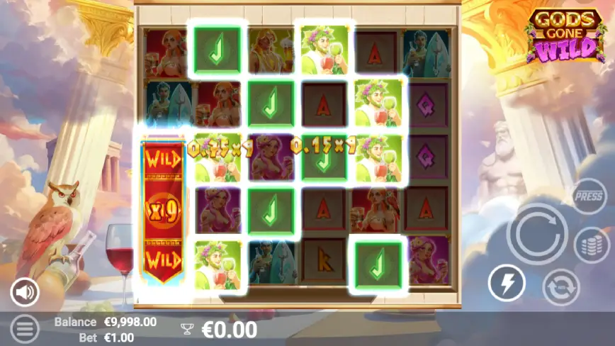 El diseño visual de Gods Gone Wild es impresionante. Ubicado entre estatuas de Zeus, el tablero del juego se destaca por su cuadrícula de 6×5 donde los gráficos y las animaciones son fluidos y detallados. Cada símbolo es una obra de arte en sí misma, desde los rangos de cartas más bajos hasta las figuras divinas que representan a los dioses. Estos detalles visuales no solo capturan la esencia de la mitología griega, sino que también mejoran la experiencia de juego al sumergir a los jugadores en un mundo mitológico rico y atractivo.