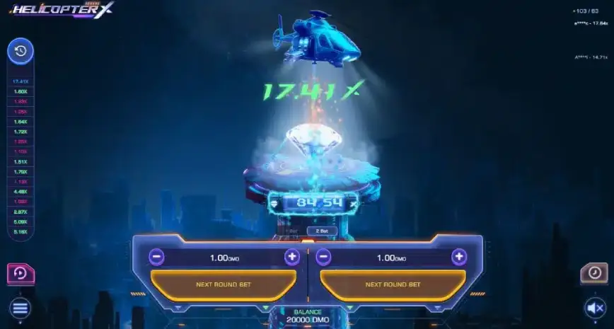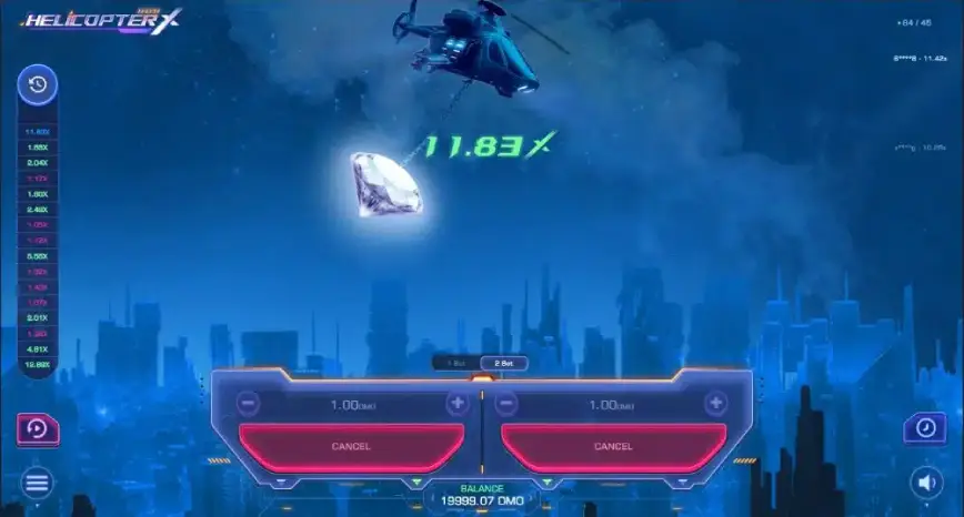 - 💯 Juega con el panel de apuestas múltiples: HelicopterX permite realizar dos apuestas simultáneamente. Usa esta función para diversificar tus riesgos con diferentes estrategias para cada apuesta.