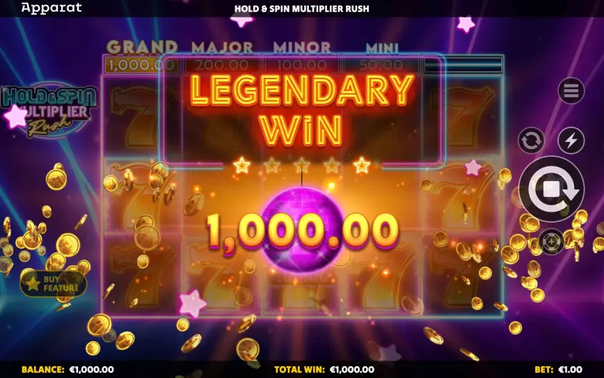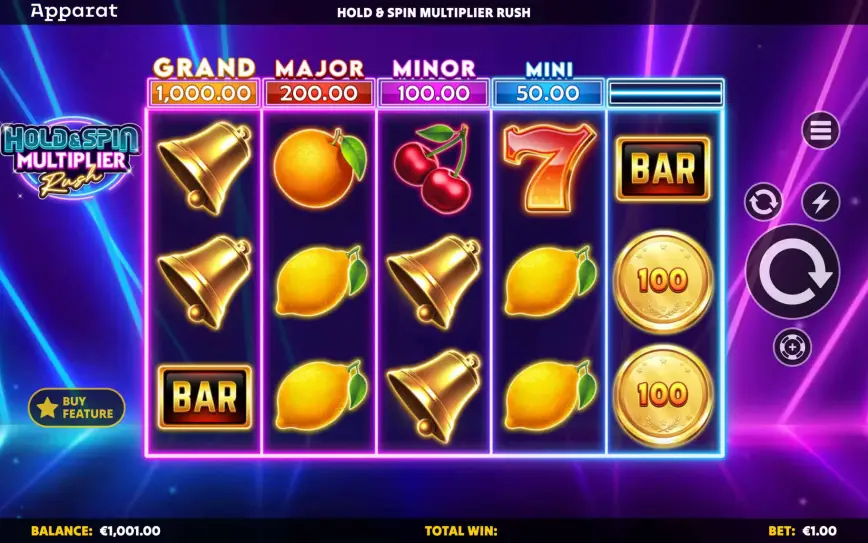 Hold & Spin Multiplier Rush es una tragamonedas que lo apuesta todo a la adrenalina, combinando gráficos neón vibrantes con una mecánica simple pero potente que puede disparar tus ganancias hasta 1.000 veces la apuesta. Con su función principal Hold & Spin, donde cada moneda activa respins y multiplicadores crecientes de hasta 100x, esta slot ofrece una experiencia de alta volatilidad pensada para jugadores que buscan grandes emociones. Desde su RTP del 96,22 % hasta su accesibilidad con apuestas desde solo 0,10 €, este juego destaca tanto por su estilo como por su potencial. Si te atraen los desafíos con recompensa real, el ritmo dinámico y la posibilidad de comprar directamente el acceso al bono, esta tragaperras de Apparat Gaming tiene todo para engancharte desde el primer giro.