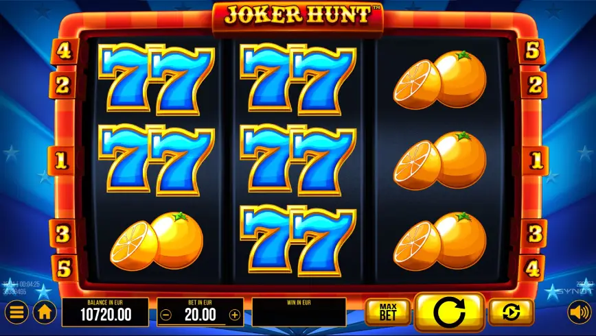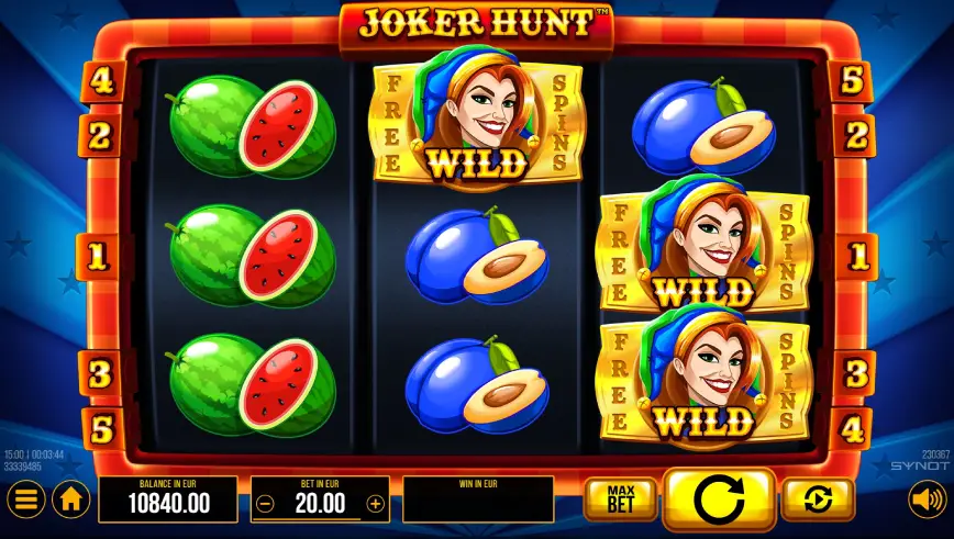 Joker Hunt presenta una configuración clásica de 3×3 con 5 líneas de pago fijas. Esta disposición tradicional permite a los jugadores disfrutar de una jugabilidad sencilla y directa, mientras que las 5 líneas de pago aseguran que siempre haya oportunidades de ganar en cada giro. Esta simplicidad en la configuración es uno de los principales atractivos para aquellos que prefieren una experiencia de juego más clásica.