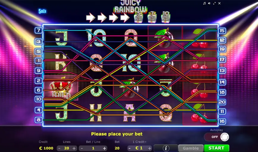 La interfaz de Juicy Rainbow es intuitiva y fácil de navegar, lo que la hace accesible tanto para nuevos jugadores como para aquellos con más experiencia en tragamonedas en línea. Las opciones de apuesta son flexibles, permitiendo apuestas desde 0,20$ hasta 20$, lo que satisface las preferencias de una amplia gama de jugadores. Con funciones especiales como tiradas gratis y multiplicadores, la slot garantiza que cada sesión de juego esté llena de emoción y potencial ganador.
