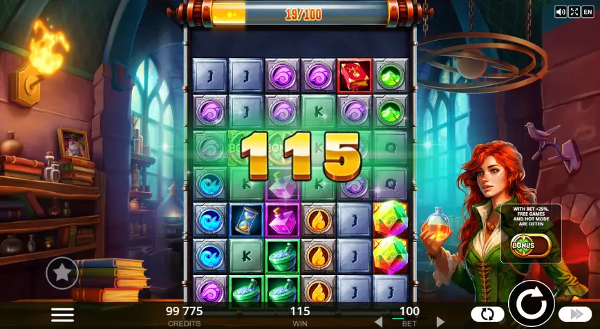 El Frasco Mágico es fundamental en esta aventura alquímica. Durante el juego base, el Medidor de Energía se llena gradualmente a medida que los jugadores logran victorias. A medida que el medidor se llena, también se acumula energía a través de símbolos gigantes, bloques de oro y símbolos Scatter. Una vez lleno, el frasco activa los Juegos Gratis en el modo “Hot”, brindando aún más oportunidades para obtener grandes recompensas y experimentar la magia del juego.