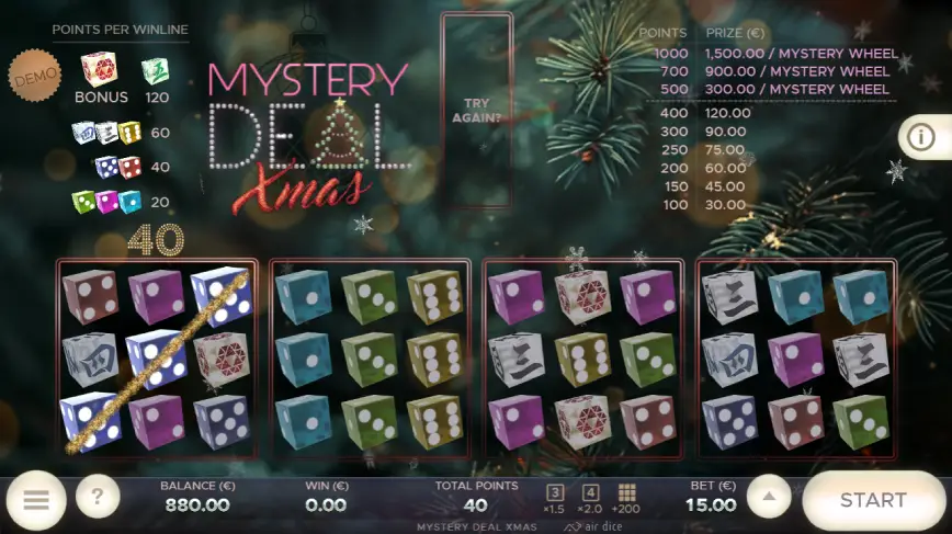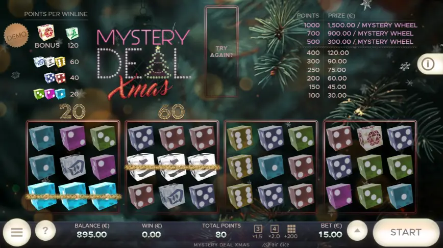 El sistema de juego de Mystery Deal Xmas es único. En lugar de carretes, el juego utiliza dados, y cada ronda consta de 12 movimientos. Durante cada movimiento, colocas una columna de tres símbolos de dados aleatorios en una de las cuatro cajas disponibles. El objetivo es alinear símbolos de dados de manera horizontal o diagonal para ganar puntos. Este enfoque estratégico requiere planificación y anticipación, ya que no puedes cambiar tus apuestas durante la ronda. Este sistema añade un nivel de profundidad y táctica que lo diferencia de muchas tragamonedas convencionales.