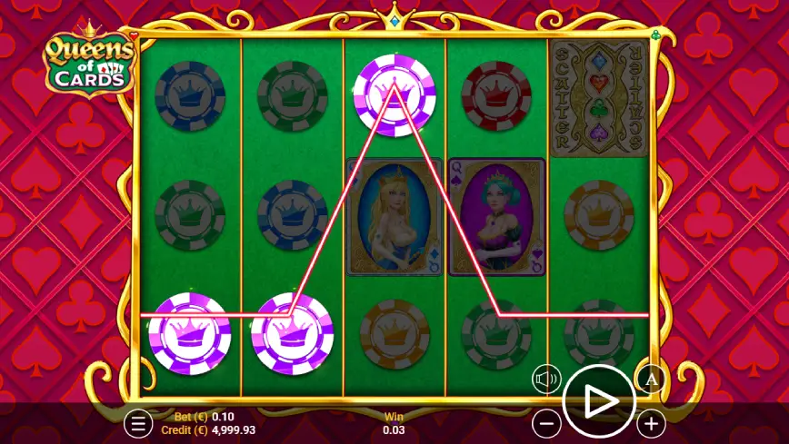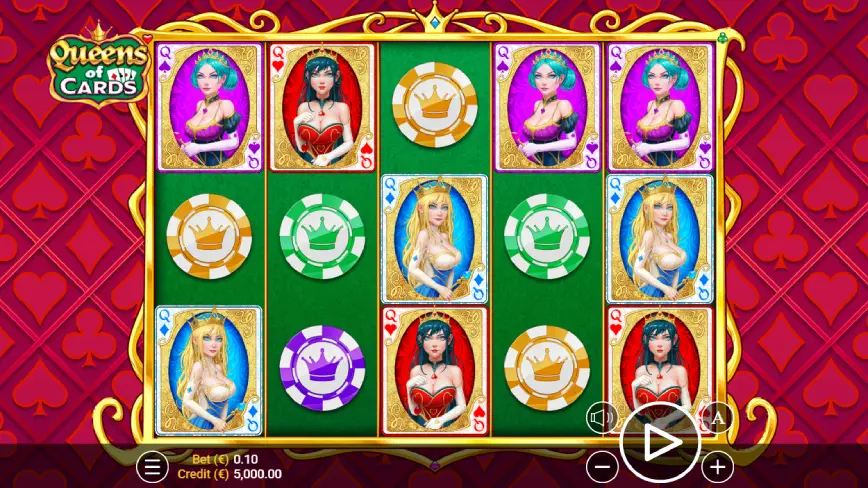 Los gráficos de Queens of Cards son simplemente impresionantes. Incorporando elementos de la realeza y las cartas, el diseño visual es una fusión de lujo y sofisticación. Cada símbolo y elemento gráfico ha sido cuidadosamente elaborado para proporcionar no solo una experiencia visual atractiva, sino también para mejorar el tema general del juego. Los colores ricos y las ilustraciones detalladas de las reinas de cada palo crean una atmósfera que es tanto envolvente como estimulante para los sentidos, haciendo que cada giro sea un deleite visual.