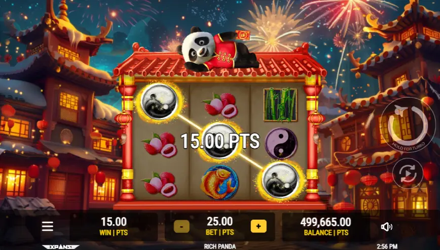 Rich Panda presenta una configuración de cuadrícula 3×3 con 5 líneas de pago fijas. Esta estructura compacta hace que el juego sea sencillo de entender, pero no le resta emoción. Las líneas de pago fijas significan que cada giro ofrece múltiples oportunidades de ganar, maximizando las posibilidades de obtener un buen retorno. Esto, combinado con un RTP del 97.2% y volatilidad media, asegura que el juego sea atractivo tanto para aquellos que buscan constancia en sus ganancias como para los que buscan la emoción de un gran premio ocasional.