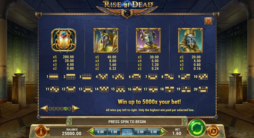 La calidad visual y auditiva de Rise of Dead es un aspecto crucial que contribuye a una experiencia de juego inmersiva y atractiva. Este juego de tragamonedas destaca por sus impresionantes gráficos y una banda sonora evocadora que complementan a la perfección la temática egipcia.
