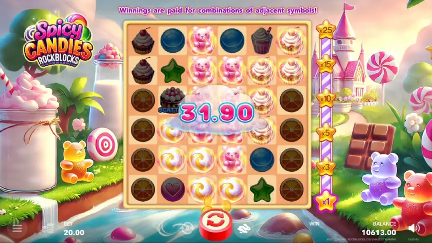 Una de las características más destacadas de Spicy Candies RockBlocks son sus combinaciones de símbolos y los multiplicadores asociados. En este juego, los bloques de símbolos adyacentes activan pagos, y al conseguir una combinación de 5 o más símbolos, se activa un multiplicador que aumenta las ganancias.