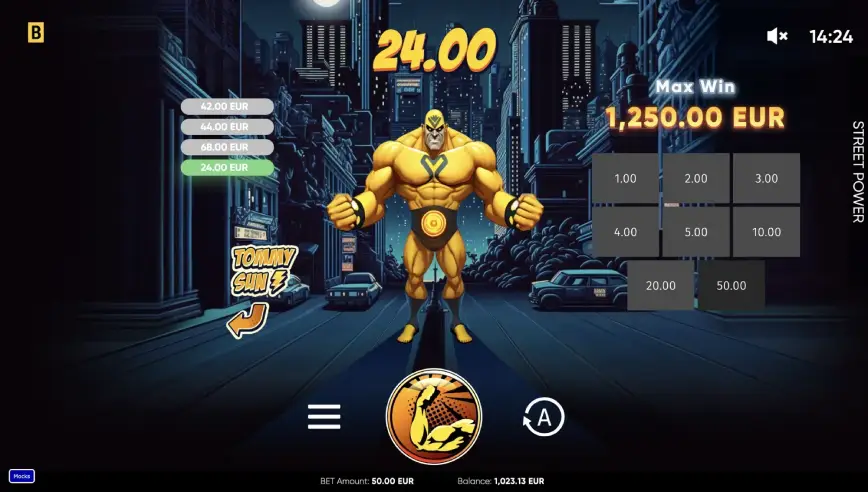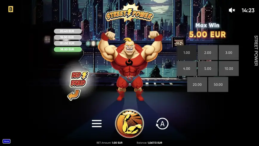 En Street Power, los multiplicadores juegan un papel crucial en la potenciación de las ganancias. Los multiplicadores x5, x25 y x100 están integrados en el juego y se aplican a las ganancias de las tiradas. Estos multiplicadores dependen del personaje que elijas, lo que añade una capa de estrategia a la experiencia de juego. Por ejemplo, al elegir a Red Braid, podrás beneficiarte de un multiplicador x50,000, mientras que Tommy Sun ofrece un potencial de hasta x250,000. La selección estratégica de multiplicadores puede hacer que las ganancias sean significativamente más altas, y los jugadores experimentados pueden aprovechar esta mecánica para maximizar sus recompensas.
