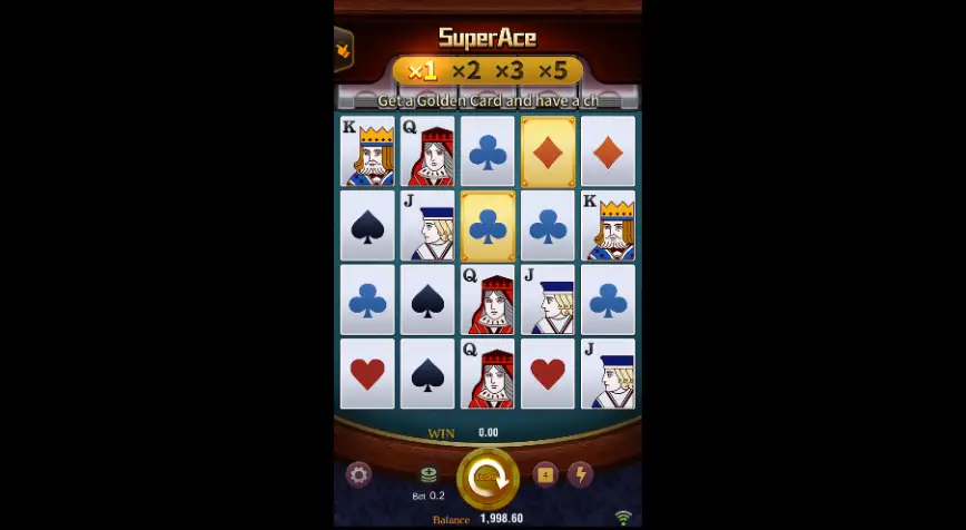 La tragamonedas Super Ace cuenta con 5 carretes y 4 filas y se beneficia de una mecánica en cascada, donde los símbolos ganadores desaparecen y son reemplazados por nuevos símbolos, dando lugar a posibles premios adicionales en un solo giro. Podrás encontrar símbolos clásicos como los palos de cartas, así como los símbolos comodín (Wild) y dispersión (Scatter).