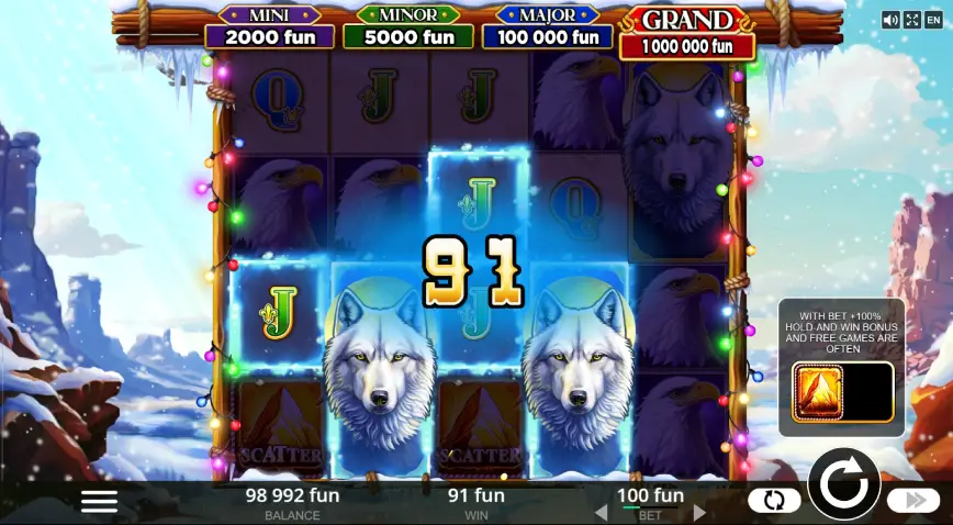 Las tiradas gratis de Winter Thunder se desencadenan con la aparición de los símbolos Scatter. Durante estas rondas, cada ganancia se multiplica por el Multiplicador Global, que es igual al número total de tiradas de bonificación. Adicionalmente, durante las rondas de tiradas gratis, es posible acumular más giros hasta un máximo de 40. Esta característica, combinada con un multiplicador progresivo, aumenta significativamente el potencial de ganancia, ofreciendo una experiencia de juego emocionante y lucrativa.